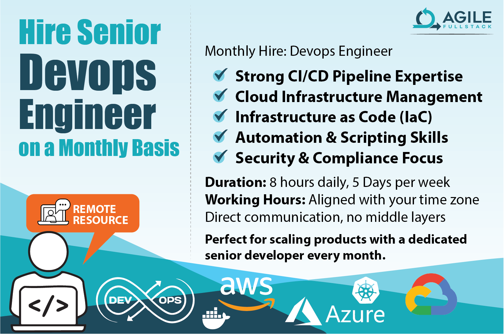 At Agile Fullstack LLC, we offer highly skilled DevOps engineers available for remote engagement, helping businesses streamline development workflows and scale infrastructure with confidence. Our engineers specialize in building and managing robust CI/CD pipelines, automating deployments, and optimizing cloud environments across AWS, Azure, and Google Cloud. With deep expertise in Docker, Kubernetes, and Infrastructure as Code (Terraform, Ansible), we ensure your systems are reliable, secure, and built for high performance.